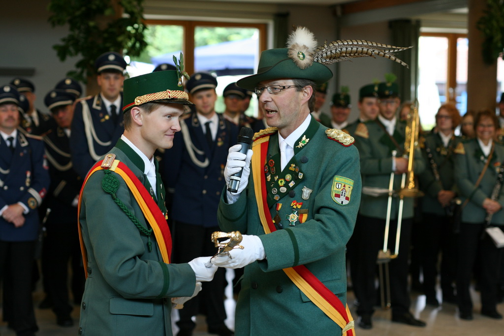 Erstmal in diesem Jahr wird neben den Hauptleuten auch der Jungschützenobmann mit einem Degen bei den Umzügen vor seiner Kompanie vorher laufen. Alexander Pütter bekam diesen von Oberst Norbert Franke überreicht.