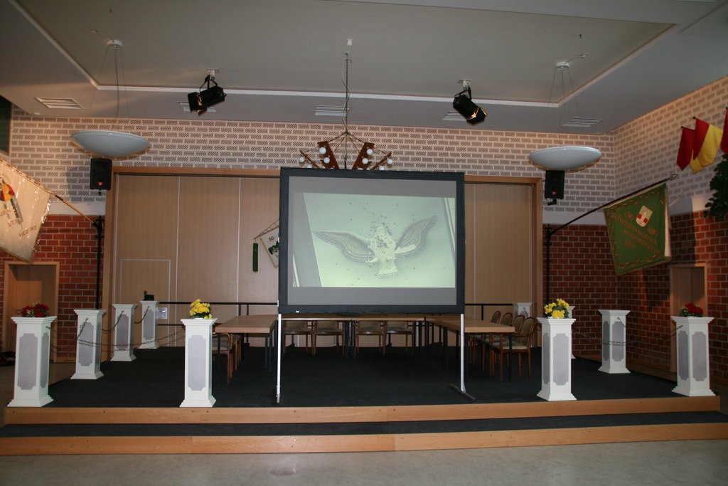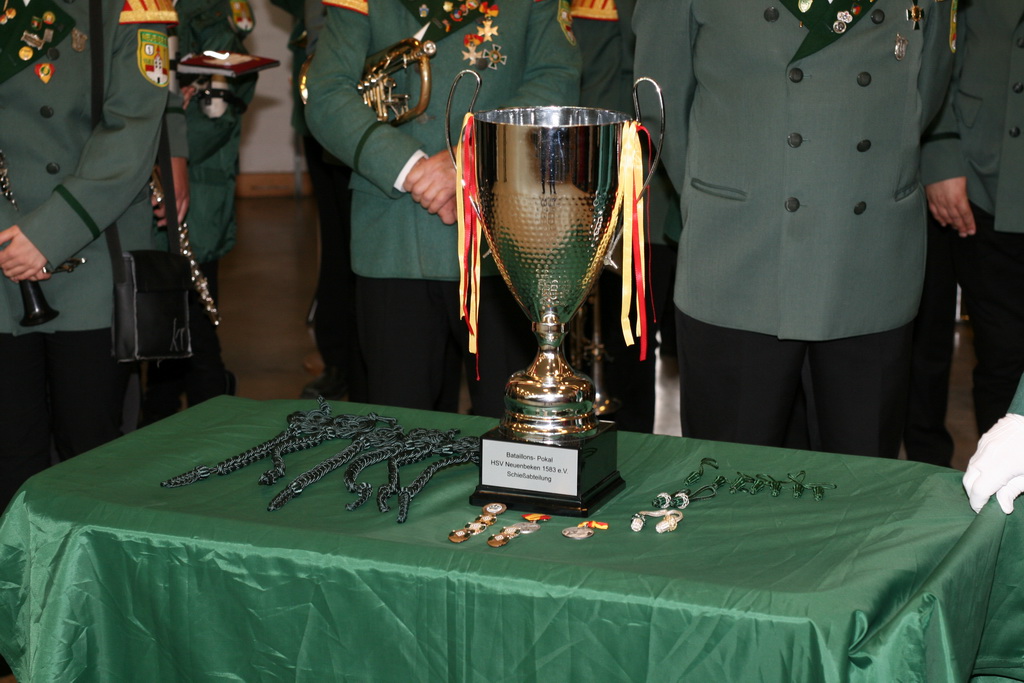 Nachdem man alle Titelträger dank der Hilfe unseres Zeugmeisters, Dietmar Kowalski und seiner Damen entsprechend eingekleidet hatte, trat das Bataillon in der Beketalhalle zur Proklamation an.