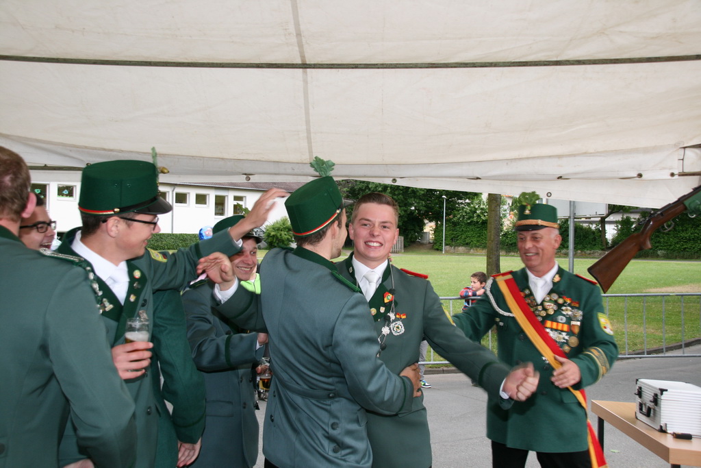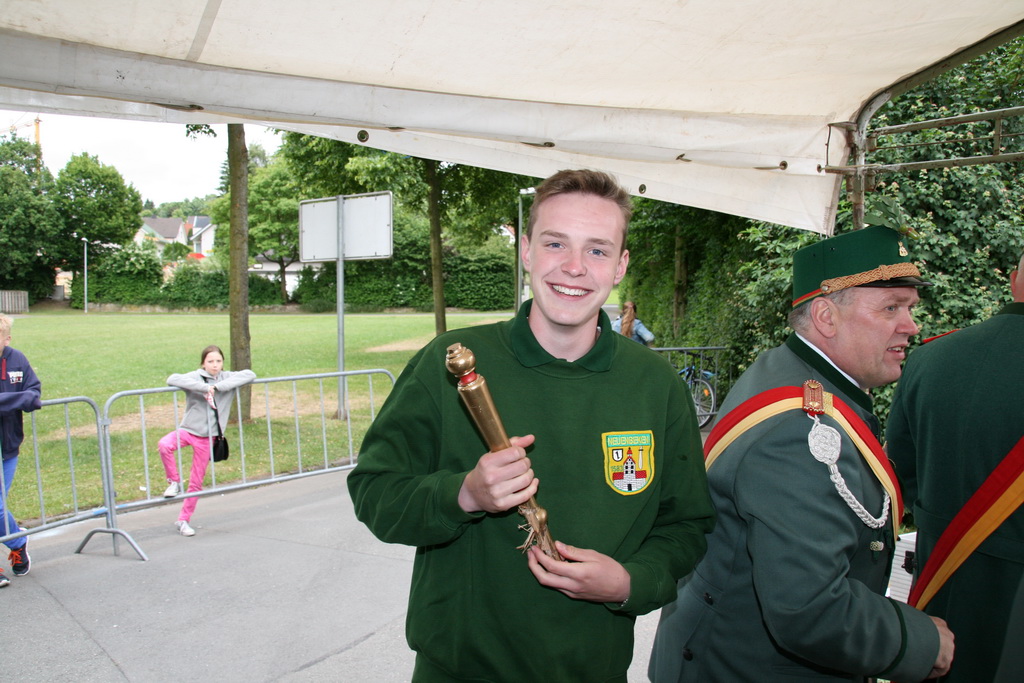 Ein gutes Dutzend jugendlicher Königsaspiranten hatten sich im umzäunten Bereich eingefunden und schossen abwechselnd auf den Vogel. 55 Schuss hielt er stand, ehe die Reste mit dem 56. Schuss aus dem Kugelfang geschossen wurden. Niko Schäfers, Offiziersanwärter bei der Bundeswehr, hatte ein zielsicheres Auge bewiesen und ist nun neuer Jungschützen-König 2015/2016.
