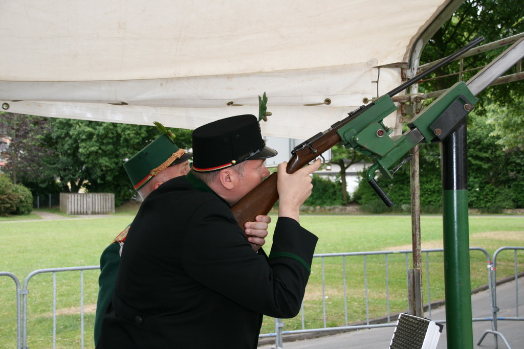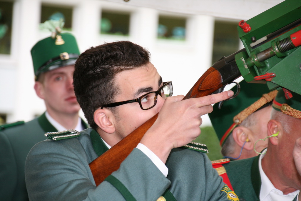 Ab jetzt ging es mit dem eigentlichen Vogelschießen los. Als erstes wurde der Jungschützen-Vogel im Kugelfang aufgezogen.